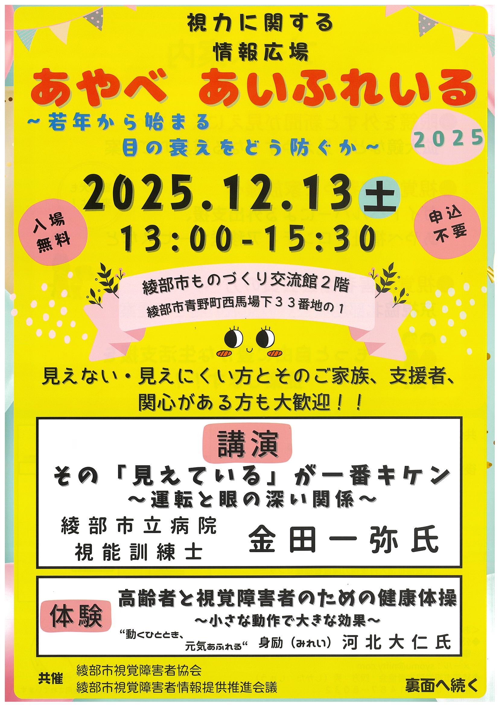 見えない・見えにくい方とその家族、支援者、関心がある方も大歓迎!!